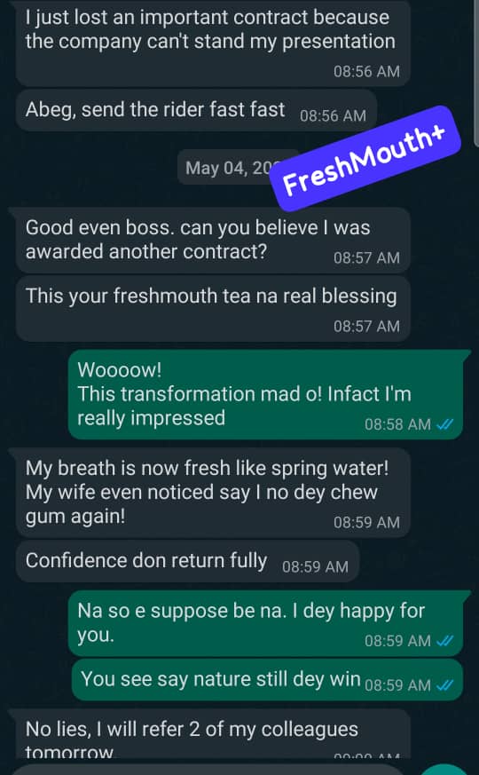 After using this tea for just one week, I noticed my mouth was no longer smelling. The odour in my mouth was no longer there. Right now, my confidence is back. The name of the product is.